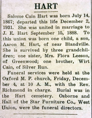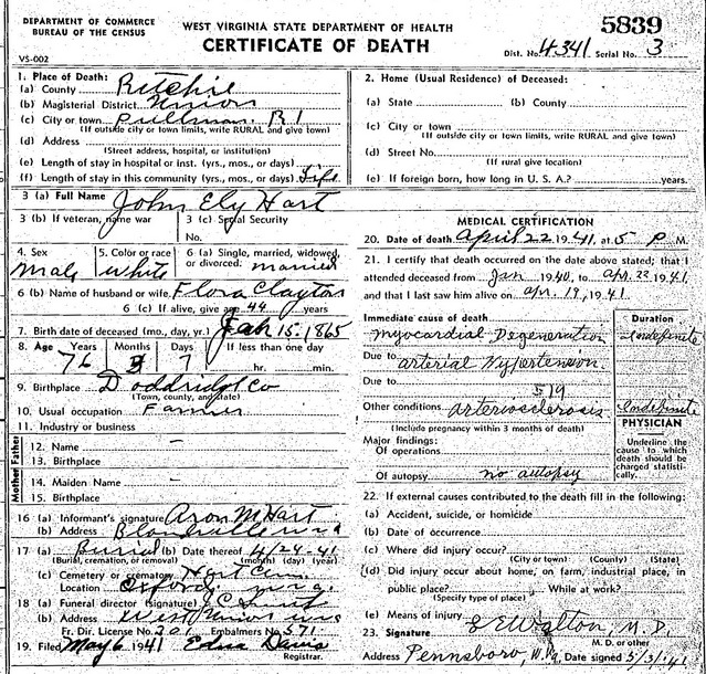 Sources: (1) Obituary of sister. (2) WV State Dept of Health, Div of Vital Statistics, Death Certificate (http://www.wvculture.org/vrr/va_dcsearch.aspx) (3) Ritchie County WV Deaths 1941-1955, Wes Cochran, 2515 10th Ave, Parkersburg, WV 26101 (Dec 1998) (4) Doddridge County Marriage Records, West Union, WV. (5) Headstone. (6) Obituary. (7) Doddridge County Marriage Records, West Union, WV, Identified as John Eli Hart, 26, b. & res. in Doddridge Co; and Celeka Celome Cain, 22, b. Ritchie Co, res. Doddridge Co. Married Sep 29 1889 at the home of Eli M. Gaston, a minister of the Gospel, who performed the ceremony. MR Bk 3, p 423 : www.wvculture.org/vrr/va_view.aspx?Id=11790989&Type=Marriage. (8) Ritchie County Birth Records, Harrisville, WV, Identified as S. S. Cain, white female, born in Ritchie County on Jul 14 1865, father (blank), mother Nancy. In a remarks column labeled "Deformity or any Circumstances of Intererst" was the notation "Promiscuous." (NOTE: Birth date of Salome Saleka Cain is given in her death record as Jul 14 1867, with father listed as John Cain and mother "Not Known." Her obituary states her birth date as Jul 14 1867, parents not given. Birth date on her headstone is also 1867. She was age 4 in the 1870 Census, enumerated on July 28th of that year, which would put her birth in 1866. The 1867 birth date would also conflict with the documented March 1867 birth date of her brother Okey.), BR p. 42 : www.wvculture.org/vrr/va_view.aspx?Id=2255458&Type=Birth. (9) 1870 Census, Ritchie County, WV (Clay Twp) (10) Headstone, Name appears as Salome Hart. (11) 1880 Census, Doddridge County, WV (Southwest District). (12) Obituary of mother. (13) Doddridge County Birth Records, West Union, WV, Identified as Aaron Omega Hart, b. June 24 1890, son of John Eli Hart (age 27) and Sleekly Salome Cain (age 22), this being the mother's first child. BR Bk 2, p. 147. (14) Obituary - Hospital. (15) Death record of mother. (16) Obituary of father. (17) Death record of father. (18) Doddridge County Marriage Records, West Union, WV, His name appears in the marriage record as "Miggie Hart" and hers as "Lizzie Price." His residence was listed as Ritchie County, WV. Her birthplace listed as Wood County, WV, at variance from her obituary, which states Wetzel County. Ceremony held at bride's home on Oct 17 1915. MR Bk 9, p. 443. (19) Doddridge County WV Marriages 1845-1937, Wes Cochran, 156 Gihon Meadows, Apt 150, Parkersburg, WV 26101 (Jan 1993) Event Notes Note (1) Headstone states 1866, and age 26 given at time of 1889 marriage would put birth in about 1863, but death record states that he died Apr 22 1941 at age 76y3m7d, which would put birth at Jan 15 1865. Note (2) Undated obituary clipping states only that John Eli Hart died "Tuesday afternoon" at age 76. Headstone for double grave of John Eli Hart and wife Salome has her birth & death years (1867-1930), but only his birth year of 1866. The obituary also stated that his first wife, Salome Cain Hart, had "died ten years ago." These discrepancies are clarified by his death record, which states that he was born on Jan 15 1865 and died on Apr 22 1941 at age 76y 3m 7d. Note (3) Headstone reads 1930, but death record clearly shows death date as Dec 2 1931. Note (4) Birth record shows birth on Jun 24 1890 in Doddridge Co, but obituary says Jun 24 1891 in Ritchie Co.Name Index