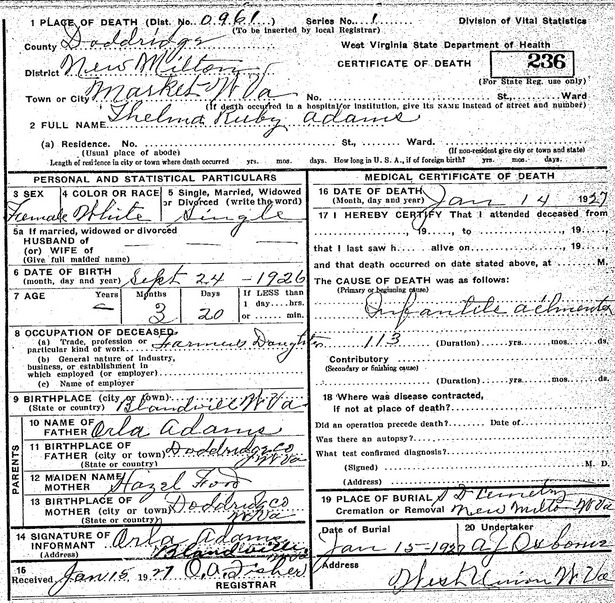 F Child 1: Hazel Juanita Adams Census name: Wauneta Adams 5 Born: Aug-12-1924 in Porto Rico (New Milton), Doddridge Co, WV 12,13,14 Died: Dec-21-1980 13 Buried: in Evergreen Cemetery (North) (aka Arlington), Rt 2 N of Parkersburg, Wood Co, WV 15 Resided: in Williamstown, Wood Co, WV 16,17,4 Resided: 1947 in Doddridge Co, WV 14 Census: 1940 at Freds Run (Oxford), Doddridge Co, WV Census: 1930 in Union District, Ritchie Co, WV Husband: James Douglas Snyder b. Dec-17-1921 d. Feb- 2-1999 Also known as: Douglas Snyder 14 Married: Sep-27-1947 at Greenwood, Doddridge Co, WV 14F Child 2: Thelma Ruby Adams Born: Sep-24-1926 in Blandville, Doddridge Co, WV 18 Died: Jan-14-1927 at Market, Doddridge Co, WV 18,19 Buried: in Middle Island 7th Day Bapt Cem, Sugar Camp, New Milton, Doddridge Co WV 18