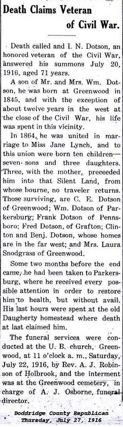 Sources: (1) Obituary. (2) 1900 Census, Doddridge County, WV (Central District) (3) Doddridge County Death Records, West Union, WV. (4) Donald Edward Ramage, Doddridge County Cemeteries, Vol. II, 4117 Almaville Rd, Smyna TN 37167 (1988, rev. 1999) (5) U.S. Civil War Draft Registrations Records, 1863-1865 [database on-line], Ancestry.com and National Archives. (6) 1890 Veterans Schedules [database online], Ancestry.com and National Archives & Records Administration. (7) Military Grave Marker. (8) Death record of son. (9) Death record of daughter. (10) Obituary of husband. (11) Obituary of wife. (12) Doddridge County Marriage Records, West Union, WV. (13) Ohio Deaths, 1908-1932, 1938-1944, and 1958-2007 (online), Ancestry.com and Ohio Department of Health. (14) Obituary of mother. (15) Obituary of father. (16) 1900 Census, Wirt County, WV. (17) 1910 Census, Wood County, WV. (18) Doddridge County Marriage Records, West Union, WV, Identified as Judson W. Dotson, age 19 as of Nov 25 1884, b. & res. in Doddridge Co; and Dollie H. Leeson, age 17 as of Jan 18 1885, b. & res. in Doddridge Co. Married Jun 30 1885 "at the residence Bride's mother Widow Leeson," officiated by Wm. L. Oliver, a regular Minister of the Gospel. Informants for marriage license: J. W. Dotson & A. Leeson. MR p. 10 : www.wvculture.org/vrr/va_view.aspx?Id=11790403&Type=Marriage. (19) WV State Dept of Health, Div of Vital Statistics, Death Certificate (http://www.wvculture.org/vrr/va_dcsearch.aspx) (20) Marion County Marriage Records, Fairmont, WV. (21) Doddridge County WV Deaths 1853-1969, Wes Cochran, 156 Gihon Meadows, Apt 150, Parkersburg, WV 26101. (22) Obituary of daughter. (23) Doddridge County WV Marriages 1845-1937, Wes Cochran, 156 Gihon Meadows, Apt 150, Parkersburg, WV 26101 (Jan 1993) (24) 1920 Census, Doddridge County, WV (Central District). (25) Headstone (year only) (26) Headstone. (27) Doddridge County Marriage Records, West Union, WV, Identified as Frank Dotson, 24, b. Sumner Co Kansas, res. Doddridge Co; and Eva Leeson, 17, b. & res. in Doddridge Co. Married Jan 9 1899 "at William Dotson's residence." Informants for marriage license: Frank Dotson & A. D. Leeson. MR p. 33 : http://www.wvculture.org/vrr/va_view.aspx?Id=11793658&Type=Marriage. (28) Doddridge County Death Records, West Union, WV, Identified as Mrs. William Williams, age (obscured), married, died Mar 3 1910 in Doddridge Co, cause of death childbirth. DR p. 177. (29) Doddridge County WV Marriages 1845-1937, Wes Cochran, 156 Gihon Meadows, Apt 150, Parkersburg, WV 26101 (Jan 1993), Identified as William H. Williams, 25, of Doddridge Co; and Minnie O. Dotson, 19, b. Sumner Co Kansas, res. Doddridge Co. Married Apr 20 1896. (30) Newspaper wedding announcement, West Union Record, 5/20/1915. Event Notes Note (1) in a far western state Note (2) in a far western stateName Index