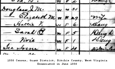 F Child 1: Hattie V. Douglass Born: ca 1874 in West Virginia 3 Census: 1880 in Grant District, Ritchie Co, WV