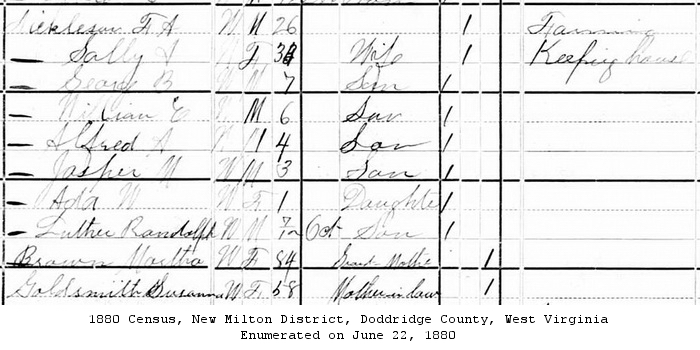 Born: ca 1846 in Lewis Co, (W)VA 1 Died: Sep-14-1908 in Doddridge Co, WV 7 Census: 1880 in New Milton District, Doddridge Co, WV Resided: 1871 in Doddridge Co, WV 3 Father: Alfred Goldsmith ( - 1880) Mother: Susanna ___ (1822 - ) Notes