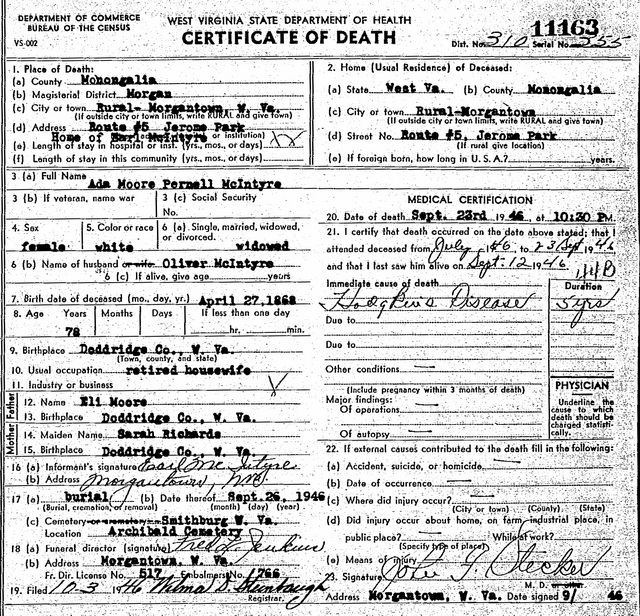 Sources: (1) Death record of wife. (2) Death Record - Birth date calculated from age at death. (3) Obituary, Excerpt from obituary in the "West Union Herald," Nov 23 1916: "Deceased was taken sick while going from Harlin to his home on Morgans Run and fell from his horse. He was found by a neighbor and taken home, where he died Wednesday morning, apparently of indigestion." (4) Doddridge County Death Records, West Union, WV. (5) Doddridge County Marriage Records, West Union, WV, Identified as James Latham Pinell, age 23 as of Apr 7 1886, b. & res. in Doddridge Co; and Ada F. Moore, age 16 as of Apr 27 1886, b. & res. in Doddridge Co. Married Apr 18 1886 "at road crossing near Smithton Church" by B. F. Rogers, a minister of the M. E. Church W.Va. Conference. Informants for marriage license: James L. Pinell & V. Moore. MR p. 83 : www.wvculture.org/vrr/va_view.aspx?Id=11790024&Type=Marriage. (6) WV State Dept of Health, Div of Vital Statistics, Death Certificate (http://www.wvculture.org/vrr/va_dcsearch.aspx), http://www.wvculture.org/vrr/va_view.aspx?Id=1453632&Type=Death. (7) 1880 Census, Doddridge County, WV (Grant District) (8) Death record of husband. (9) Doddridge County Marriage Records, West Union, WV, http://www.wvculture.org/vrr/va_view.aspx?Id=11796334&Type=Marriage. (10) Obituary of brother. (11) Obituary of father. (12) Social Security Death Index. (13) Ohio Deaths, 1908-1932, 1938-1944, and 1958-2007 (online), Ancestry.com and Ohio Department of Health. (14) Social Security Death Index, Social Security card issued in West Virginia before 1951. (15) West Virginia Marriages Index, 1785-1971 [database on-line], Ancestry.com. (16) 1930 Census, Doddridge County, WV (Central District). (17) 1940 Census, Doddridge County, WV (Central District) (18) 1920 Census, Tyler County, WV. (19) Doddridge County Marriage Records, West Union, WV. (20) Marriage record of son. (21) 1900 Census, Doddridge County, WV (Grant District) (22) Virginia Death Records, 1912-2014 [database on-line], Ancestry.com. (23) Doddridge County Marriage Records, West Union, WV, http://www.wvculture.org/vrr/va_view.aspx?Id=11795452&Type=Marriage. (24) 1910 Census, Doddridge County, WV (Grant District). (25) World War II Draft Cards Young Men, 1940-1947 [database on-line], Ancestry.com. Event Notes Note (1) Age in 1886 marriage record stated as 23 as of Apr 7 1886, putting birth date at Apr 7 1863. But the 1860/1870/1880 censuses indicate a birth year of about 1856/58, while the 1900 Census states Apr 1858, and age 59y 8m 6d in death record corresponds to a birth date of Mar 9 1857. Note (2) Age in 1886 marriage record stated as 16 as of Apr 27 1886, putting age in about 1870. But age 12 in 1880 Census puts it in about 1868. Birth record shows it to be Apr 7 1868, but her death record states Apr 27 1868. Note (3) In household of daughter and son-in-law, Lelia & Earl McIntyre. Note (4) Birth date given in death record as Nov 25 1902, but in marriage record and SSDI as Nov 27 1902.Name Index