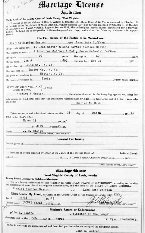 Sources: (1) Veterans Administration, http://gravelocator.cem.va.gov. (2) Lewis County Marriage Records, Weston, WV. (3) Social Security Death Index. (4) Harrison County Marriage Records, Clarksburg, WV. (5) National Archives and Records Administration, World War I Draft Registration Cards, 1917-1918 (Ancestry.com online database) (6) Lewis County Marriage Records, Weston, WV, Identified as Charles Nicoles Gaston, 49, b. Jan 5 1899 in Lewis Co, res. Weston, son of T. Chas Gaston & Nona Myrtle Nicoles Gaston; and Lena Esta Coffman, 47, b. Nov 22 1901 in Taylor Co, res. Lewis Co, dau of Arther Lee Coffman & Emily Susan McDaniel. Married Apr 15 1949 in Clarksburg. (Note: Although the ceremony was held in Harrison County, the marriage is recorded in Lewis County, residence of the bride.), MR p. 33.Name Index