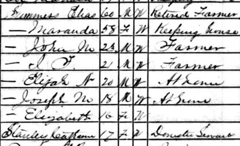 Sources: (1) Headstone - Date calculated from age at death. (2) 1870 Census, Ritchie County, WV (Union Twp). (3) Minnie Kendall Lowther, History of Ritchie County (1911, reprinted 1999, McClain Printing Co, Parsons WV, http://McClainPrinting.com), p. 339. (4) Headstone. (5) Ritchie County Historical Society (David M. Scott, Editor), Ritchie County, West Virginia Cemeteries through 1993, McClain Printing Co, Parsons, WV, 1995. (6) Marriage record of son. (7) Minnie Kendall Lowther, Ritchie County in History and Romance (McClain Publishing Co, Parsons, WV, 1990), p. 299. (8) Headstone (year only) (9) Findagrave.com. (10) 1860 Census, Ritchie County, (W)VA. (11) Ritchie County WV Marriages 1843-1915, Wes Cochran, 2515 10th Ave, Parkersburg WV 26101 (July 1985) (12) Military Grave Marker. (13) Findagrave.com, Name on marker: J. A. Summers. W. Va. No unit. No dates. (14) Headstone - Date calculated from age at death, 37 yrs, 9 mos. (15) 1900 Census, Ritchie County, WV (Union District). (16) Elizabeth Estlack Mullett (compiler, 1981), Tyler County WV Marriages 1852-1890, Wes Cochran, 2515 10th Ave, Parkersburg WV 26101. (17) 1910 Census, Ritchie County, WV (Union District). (18) Ritchie County WV Marriages 1843-1915, Wes Cochran, 2515 10th Ave, Parkersburg WV 26101 (July 1985), Identified as Thomas T. Pritchard, 29, of Ritchie Co, son of Thomas D. & Mary; and Lucy A. Summers, 26, of Ritchie Co, dau of Elias & Maranda. Married Dec 4 1878. Event Notes Note (1) age 37 given in 1880 Census would put birth in about 1843 Note (2) Birth date on headstone is 1847. But census records consistently show it to be in or about 1843. Note (3) Listed as I. F. (?) Summers, age 21. Note (4) Date on headstone is Nov 19 1848. But age 9 in 1860 Census, in which he was between older brother Israel and younger brother Joseph, puts it in about 1850/51. Note (5) Name on headstone: E. N. Summers.Name Index
