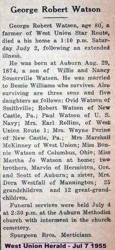 Jul-28-2018Husband: George Robert Watson Born: Aug-29-1874 in Auburn, Ritchie Co, WV 1 Died: Jul- 2-1955 near West Union, Doddridge Co, WV 2,1 Buried: in Auburn Community Cemetery, Ritchie Co, WV 3,2 Resided: near West Union, Doddridge Co, WV 2 Resided: 1935 at Toll Gate, Ritchie Co, WV 4 Census: 1930 in Central District, Doddridge Co, WV Occupation: farmer 2 Father: Wilson D. "Willis" Watson (1850 - 1930) Mother: Nancy Rhuhama Sommerville (1852 - 1941) Other spouse 2