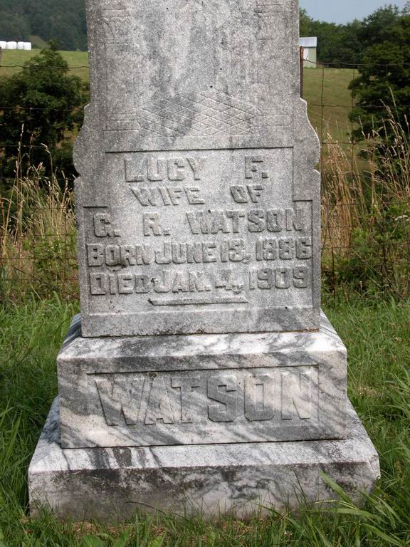 Sources: (1) Obituary. (2) WV State Dept of Health, Div of Vital Statistics, Death Certificate (http://www.wvculture.org/vrr/va_dcsearch.aspx) (3) Ritchie County Historical Society (David M. Scott, Editor), Ritchie County, West Virginia Cemeteries through 1993, McClain Printing Co, Parsons, WV, 1995. (4) Death record of daughter. (5) Doddridge County Marriage Records, West Union, WV, Identified as George Watson, age 27, of Ritchie Co; and Lucy Inghram, age 16, of Doddridge Co. Married Aug 19 1902. Informants: George Watson & Eli Tucker. MR Bk 6, p. 465. (6) Headstone. (7) 1900 Census, Doddridge County, WV (Central District) (8) Doddridge County WV Marriages 1845-1937, Wes Cochran, 156 Gihon Meadows, Apt 150, Parkersburg, WV 26101 (Jan 1993) (9) Obituary of wife. (10) Social Security Death Index. (11) Obituary of father. (12) Social Security Death Index, Social Security card issued in West Virginia before 1951. (13) Headstone (year only) (14) Death record of wife. Event Notes Note (1) Although more commonly known as Ovid Watson, his name was given in his wife's obituary and in his own SSDI listing as Ovied P. Watson. Note (2) Birth date on headstone is 1908.Name Index