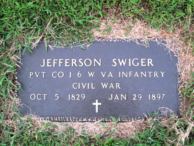Sources: (1) Doddridge County WV Marriages 1845-1937, Wes Cochran, 156 Gihon Meadows, Apt 150, Parkersburg, WV 26101 (Jan 1993) (2) Grave marker. (3) Doddridge County Death Records, West Union, WV. (4) 1890 Veterans Schedules [database online], Ancestry.com and National Archives & Records Administration. (5) 1870 Census, Doddridge County, WV (McClellan Twp) (6) U.S. Civil War Soldiers, 1861-1865 [database online], National Park Service , Ancestry.com. (7) U.S. Civil War Pension Index: General Index to Pension Files, 1861-1934 [database on-line], Ancestry.com and National Archives & Records Administration. (8) Military Grave Marker. (9) Marriage record of son. (10) Headstone. (11) Findagrave.com, Name on headstone: M. E. - wife of Jefferson Swiger. (12) Donald Edward Ramage, Doddridge County Cemeteries, Vol. III, 4117 Almaville Rd, Smyna TN 37167 (1988, rev. 1999) (13) Findagrave.com. (14) Doddridge County Marriage Records, West Union, WV. (15) Doddridge County Marriage Records, West Union, WV, Identified as Jesse Swiger, 22, b. & res. in Doddridge Co, son of Jefferson & Margaret E. Swiger; and Lydia M. Lyons, 16, b. & res. in Doddridge Co, dau of Elias & Levina (or Levira) Lyons. Married Jul 5 1876 in Doddridge County, officiated by T. F. Kemper. MR p. 212, Line 33 : http://www.wvculture.org/vrr/va_view.aspx?Id=11792280&Type=Marriage. (16) The History of Doddridge County, West Virginia, Taylor Publishing Co, 1979, p. 260. (17) Headstone (year only) (18) West Virginia Deaths Index, 1853-1973 [database on-line], Ancestry.com. (19) WV State Dept of Health, Div of Vital Statistics, Death Certificate (http://www.wvculture.org/vrr/va_dcsearch.aspx) (20) 1900 Census, Doddridge County, WV (McClellan District) (21) Death record of wife. (22) Obituary. (23) Death Record - Birth date calculated from age at death. (24) Doddridge County Death Records, West Union, WV, Identified as Kizzie Swiger, white female, single, born in Doddridge Co, dau of Jefferson & Margaret E; died Apr 24 1887 in Doddridge Co, age 17y 10m 18d, cause of death consumption. Informant: Jefferson, father. (Note: Age at death calculates to a birth date of Jun 6 1869, but "Doddridge County Cemeteries" reports date on headstone as Jun 16 1869, and death date as Apr 3 1887, with name given as K. L. Swiger. The reading was done by WPA in 1932, and the marker is no longer legible.), DR p. 47. (25) Marriage record of daughter. (26) 1880 Census, Doddridge County, WV (McClellan District). (27) West Virginia Marriages Index, 1785-1971 [database on-line], Ancestry.com. (28) Findagrave.com, Name on headstone: Jane Kelley. Event Notes Note (1) Death date on military grave marker is Jan 29 1897, but death record shows it as Jan 31 1897. Age 68y 3m 26d in death record calculates to a birth date of Oct 5 1828, but grave marker shows it as Oct 5 1829. Note (2) In household of daughter and son-in-law Fannie & Lloyd W. Cain. Note (3) Birth date given in 1900 Census as Aug 1857, age 42. But birth record and death record show it as Aug 4 1861. He was age 8 in 1870 Census. Note (4) Birth date given in 1900 Census (enumerated in household of sister & brother-in-law Rachel & George Anderson) as May 1866, age 34. But age 2 in 1870 Census puts it in about 1868.