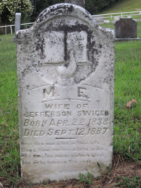 Husband: Jefferson Swiger Born: Oct- 5-1829 1,2 Died: Jan-31-1897 in Doddridge Co, WV 3 (see note 1) Buried: in Center Point Christian Church Cemetery, Doddridge Co, WV 2,3 Resided: 1890 at Center Point, Doddridge Co, WV 4 Census: 1870, 1880 in McClellan District, Doddridge Co, WV Census: 1850, 1860 in Doddridge Co, (W)VA Occupation: farmer 5 Military: Feb-18-1865 - Jun-10-1865 Pvt, Co I, 6th W.Va. Inf, Civil War 6,7,4,8 Father: Barnes Swiger (1808 - 1859) Mother: Mary Marsh (1805 - 1885)