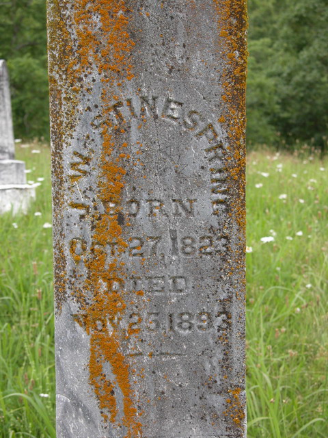 Sources: (1) Headstone. (2) Doddridge County WV Marriages 1845-1937, Wes Cochran, 156 Gihon Meadows, Apt 150, Parkersburg, WV 26101 (Jan 1993) (3) Doddridge County WV Deaths 1853-1969, Wes Cochran, 156 Gihon Meadows, Apt 150, Parkersburg, WV 26101. (4) Marriage record of son. (5) Death Record - Birth date calculated from age at death. (6) Doddridge County Death Records, West Union, WV. (7) 1900 Census, Doddridge County, WV (Southwest District) (8) Ritchie County WV Marriages 1843-1915, Wes Cochran, 2515 10th Ave, Parkersburg WV 26101 (July 1985) (9) Ritchie County WV Marriages 1843-1915, Wes Cochran, 2515 10th Ave, Parkersburg WV 26101 (July 1985), Identified as William L. Stinespring, 23, of Doddridge Co, son of John W. & Mary Ann; and Mary E. Dotson, 18, of Ritchie Co, dau of Hiram S. & Susan J. Married Sep 18 1873. (10) Doddridge County Death Records, West Union, WV, Identified as Rachel A. Stinespring, white female, dau of J. W. & M. A. Stinespring; died Aug 12 1859 at Hughes River, age one day, cause of death unknown. (Note: The entry immediately above this one is that of Rachel's mother, identified as M. A. Stinespring, age 35y 7m, died on Jul 29 1859 at Hughes River, cause unknown. Informant for both deaths was John W. Stinespring, husband and father. Clearly, Rachel could not have been only one day old if her mother had died two weeks earlier.), DR p. 5.Name Index