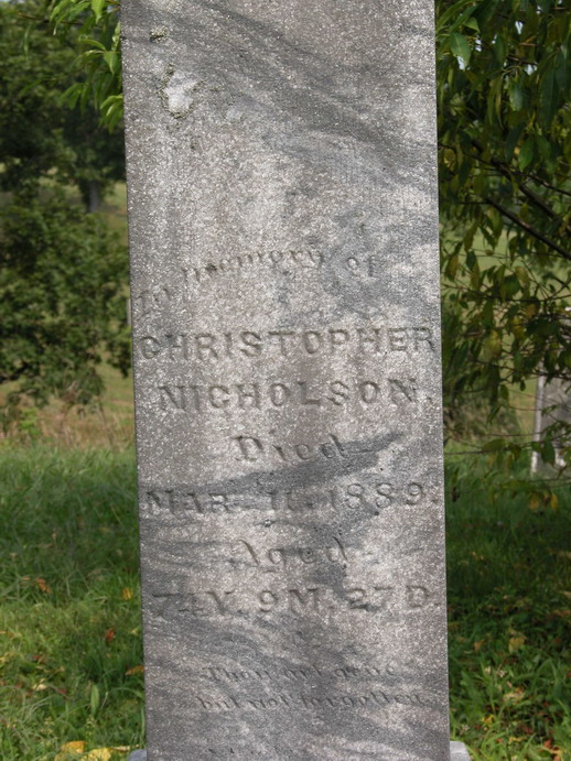 Husband: Christopher Columbus Nicholson 1 Born: May-12-1814 2 Died: Mar-11-1889 in Doddridge Co, WV 3,4,1 Buried: in Cabin Run Cemetery, Doddridge Co, WV 4 Census: 1880 in Southwest District, Doddridge Co, WV Census: 1860 in Doddridge Co, (W)VA Census: 1850 in Madison Co, VA Occupation: farmer 5 Father: Mother: