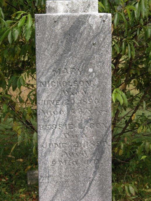 F Child 10: Mary Susan Nicholson Born: 1854 in Madison Co, VA 26,1,13,27 Died: 1934 26,1 Buried: in Indian Fork Baptist Cemetery, New Milton (Coldwater), Doddridge Co WV 28 Census: 1860 in Doddridge Co, (W)VA Husband: Philip Wesley Cox b. Mar-17-1853 d. Apr-17-1933 Also known as: W. Phillip Cox 7 Married: Apr-20-1876 in Doddridge Co, WV 13