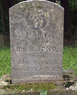 Born: Oct-29-1799 in Baltimore County, MD 3,4 Died: Aug- 9-1868 in West Union, Doddridge Co, WV 5,6 Buried: in Freeman-Coleman Cemetery, Rt 18 N (Crystal Lake), West Union, WV 4 Cause of death: typhoid fever 7 Census: 1850, 1860 in Doddridge Co, (W)VA Occupation: blacksmith 7,8,6 Father: Benjamin Bond, Jr. Mother: Nancy Ann BarneyWife: Mary "Polly" Smith 2,9,10 Also known as: Polly Smith 9,10 Born: Jun-30-1809 in Greene Co, PA 1 Died: Jan-11-1883 in Harrison Co, WV 1 Buried: in Freeman-Coleman Cemetery, Rt 18 N (Crystal Lake), West Union, WV Census: 1870, 1880 in West Union District, Doddridge Co, WV (see note 1) Census: 1850 in Doddridge Co, (W)VA Occupation: seamstress 11 Father: Thomas Smith (1783 - 1872) Mother: Elizabeth Smith (1790 - 1872)