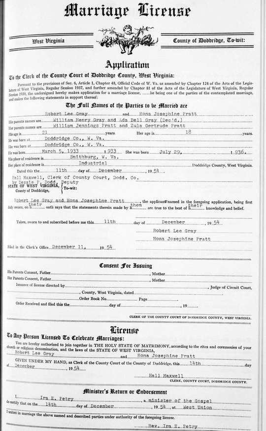 Wife: Hona Josephine "Jo" Pratt 3,7,8 Married: Dec-14-1954 in West Union, Doddridge Co, WV 5 Born: Jul-29-1936 in Doddridge Co, WV 5,1,9 Died: Jun- 2-2004 at Morgans Run (West Union), Doddridge Co, WV 2,9 Buried: in Wolverton (aka Powell or new Victory) Cemetery, Waldo Run, Doddridge Co, WV 1 Resided: at Morgans Run (West Union), Doddridge Co, WV 1 Resided: 1954 at Industrial, Doddridge Co, WV 5 Occupation: Minners Glass of Salem, and housekeeper 1 Father: William Jennings Pratt (1910 - 1965) Mother: Zula Gertrude Hurst (1911 - )