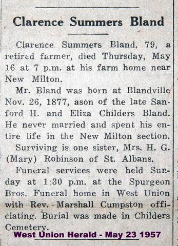 F Child 3: Lora F. Bland Census name: Lara F. Bland 6 Born: Nov- 8-1875 8,6 Died: Jan-30-1912 8 Buried: in Childers Cemetery, New Milton, Doddridge Co, WV 8 Census: 1880, 1900 in New Milton District, Doddridge Co, WVM Child 4: Clarence Summers Bland Born: Nov-26-1877 in Blandville, Doddridge Co, WV 9 Died: May-16-1957 near New Milton, Doddridge Co, WV 1,10 Buried: in Childers Cemetery, New Milton, Doddridge Co, WV 9,8 Resided: at New Milton, Doddridge Co, WV 9,14,4,15 Never married: 9,5