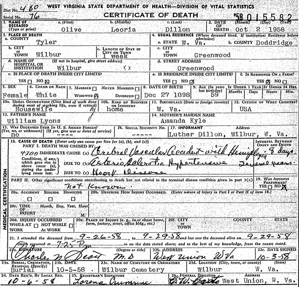 Born: Mar- 2-1868 in Monroe Co, OH 2,3 Died: Feb-13-1949 in Greenwood, Doddridge Co, WV 2,3 Buried: in Wilbur Cemetery, Wilbur, Tyler Co, WV 4,5 Resided: in Greenwood, Doddridge Co, WV Census: 1940 at Long Run, Greenwood, Doddridge Co, WV 6 Census: 1920, 1930 in McElroy District, Tyler Co, WV Occupation: farmer 6 Father: Jacob Dillon ( - 1920) Mother: Elizabeth Bunting (1848 - )Wife: Olive Leora Lyons 7,8 Also known as: Olive Leoria Lyons 9 Married: ca 1914 10 Born: Dec-27-1898 in West Virginia 9,11,3 Died: Oct- 2-1958 in Wilbur, Tyler Co, WV 9,3 Buried: in Wilbur Cemetery, Wilbur, Tyler Co, WV 9,5 Resided: at Greenwood, Doddridge Co, WV 9,12 Census: 1940 at Long Run, Greenwood, Doddridge Co, WV 6 Census: 1900, 1920, 1930 in McElroy District, Tyler Co, WV Father: William Lyons (1870 - 1946) Mother: Amanda Kile (1856 - 1912)