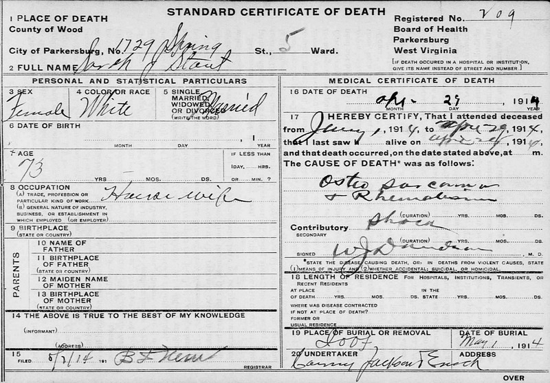 Born: May-30-1836 in Harrison Co, (W)VA 1 Died: Jul- 4-1889 in Doddridge Co, WV 2 Buried: in Walt Stout Cemetery (abandoned), PortoRico/MaxwellRidge Rd, Doddridge Co, WV 3 Resided: 1862 in Doddridge Co, (W)VA 1 Census: 1860 in Doddridge Co, (W)VA Father: Job Bray Stout (1806 - 1859) Mother: Sarah Ann Johnson (1800 - 1867)Wife: Sarah Jane Lowther 4,5,6 Married: Mar-27-1862 in Ritchie Co, WV 7 Born: Jan- 5-1841 8,1 Died: Apr-29-1914 in Parkersburg, Wood Co, WV 9 Buried: in Parkersburg Memorial Gardens (aka IOOF Cem, 24th St), Wood Co, WV 9 Census: 1910 in Parkersburg, Wood Co, WV Census: 1880, 1900 in Southwest District, Doddridge Co, WV Census: 1860 in Ritchie Co, (W)VA Father: Alexander J. Lowther (1791 - 1864) Mother: Sarah Ireland (1796 - 1841) Notes