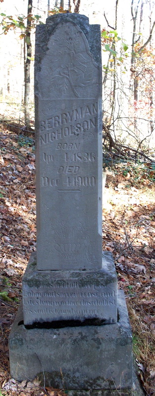 Husband: Berryman Columbus (Benjamin) Nicholson Also known as: Berry Nicholson 1 Born: Apr- 4-1836 in Madison Co, VA 2,3,4 Died: Dec- 4-1900 at Coldwater (New Milton), Doddridge Co, WV 5,2,6 Buried: in Upper Little Indian Fork Cemetery, Coldwater (New Milton), Doddridge Co, WV 7 Census: 1870, 1880, 1900 in New Milton District, Doddridge Co, WV Census: 1860 in Lewis Co, (W)VA Resided: 1857 in Doddridge Co, (W)VA 4 Census: 1850 in Madison Co, VA Occupation: farmer 8,3 Military: Aug-14-1862 - Jun-27-1865 Pvt, Co A, 14th W.Va. Inf, Civil War (POW for 3 weeks) 9,10,11 Father: Jesse Columbus Nicholson (1801 - 1857) Mother: Tabitha Nicholson (1808 - )