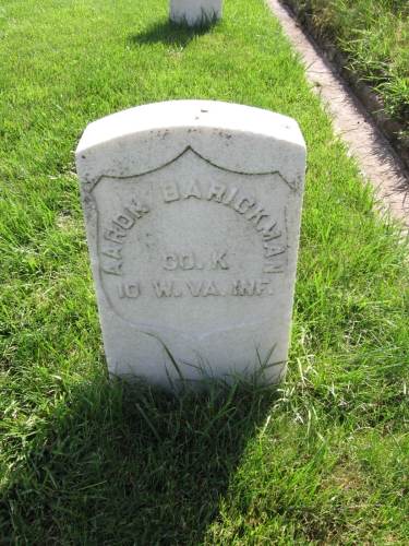 Jul-28-2018Husband: Aaron Barickman Census name: A. Barrackman Born: ca 1836 in Monongalia Co, (W)VA 1 Died: May-14-1863 in Grafton, Taylor Co, WV 2,3 Cause of death: typhoid fever 3 Census: 1860 in Doddridge Co, (W)VA Military: Pvt, Co K, 10th W.Va. Inf, Civil War 3 (see note 1) Father: Jacob Barickman Mother: Jane ___