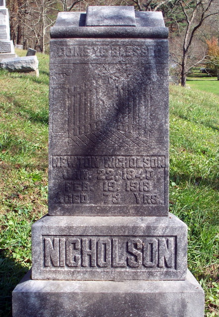 Jul-28-2018Husband: Newton Isaac Nicholson 1,2 Also known as: Nutan Nicholson 3 Born: Jan-22-1840 in Madison Co, VA 4,5,6,7 Died: Feb-19-1913 6 Buried: in Indian Fork Baptist Cemetery, New Milton (Coldwater), Doddridge Co WV 8 Census: 1910 in New Milton District, Doddridge Co, WV Census: 1900 in Troy District, Gilmer Co, WV Resided: 1890 at Coldwater (New Milton), Doddridge Co, WV Census: 1880 in New Milton District, Doddridge Co, WV Census: 1870 in Southwest District, Doddridge Co, WV Census: 1850 in Madison Co, VA Occupation: farmer 9 Military: 1861 - Nov-15-1864 Pvt, Co B & H, 7th W.Va. Inf, Civil War (gunshot wound in left shoulder) 10,11 Father: Jesse Columbus Nicholson (1801 - 1857) Mother: Tabitha Nicholson (1808 - ) Other spouse 2
