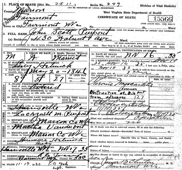 Jul-28-2018Husband: John Scott Pierpont Also known as: John Scott Pierpoint Born: May-20-1846 in Harrisville, Ritchie Co, WV 1,2,3 Died: Nov-16-1935 in Fairmont, Marion Co, WV 1,2 Buried: in IOOF Cemetery, Harrisville, Ritchie Co, WV 4 Census: 1920 in Fairmont, Marion Co, WV Census: 1910 in Harrisville, Ritchie Co, WV Resided: 1899 in Marion Co, WV 3 Census: 1880 in Union District, Ritchie Co, WV Occupation: 1920 carpenter in shop 5 Occupation: 1910 furniture store proprietor 6 Father: Zackquill M. Pierpoint (1811 - 1882) Mother: Martha Vandervort (1815 - 1900) Other spouse 2