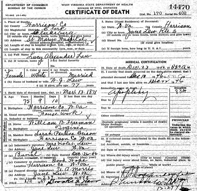 Wife: Lucy Alexander Freeman 6,4 Married: Mar-21-1888 in Harrison Co, WV 3 Born: Mar-13-1871 in Harrison Co, WV 7,2 Died: Dec-23-1946 in Clarksburg, Harrison Co, WV 7,2 Buried: in Good Hope Masonic Cemetery, Rt. 19 S, Harrison Co, WV 7,5 Resided: in Jane Lew, Lewis Co, WV 7 Father: William B. Freeman (1852 - ) Mother: Sarah Pauline Deison (1843 - )