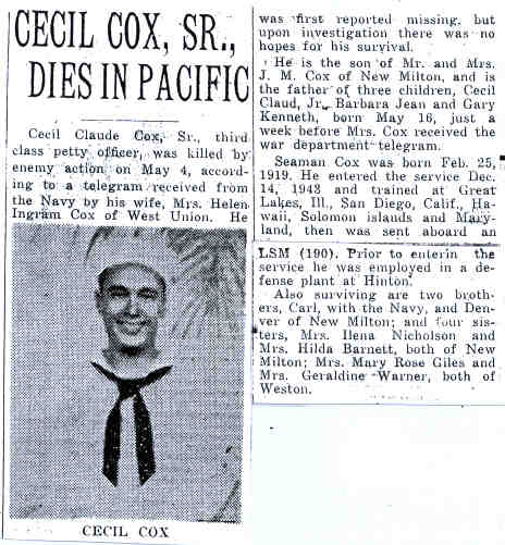 Sources: (1) Doddridge County Birth Records, West Union, WV, BR Bk 4, p. 34. (2) West Virginia Veterans Memorial Archives Database, http://www.wvculture.org/history/wvmemory/wvvetmem.html. (3) Immediate family. (4) West Union Herald-Record, 5/26/1998, p. 13 - Article by VFW Post 3408. (5) Obituary. (6) West Virginia Veterans Memorial Archives Database, http://www.wvculture.org/history/wvmemory/wvvetmem.html, Cecil Cox's widow was informed by letter that his ship, the USS LSM 190, was sunk 30 miles off the coast of Okinawa. The website www.navsource.org states that the LSM 190(R) was launched on Sep 21 1944, commissioned on Nov 23 1944, and participated in the Okinawa Gunto Campaign Mar 26 to May 4 1944. The ship was hit and sunk by a Japanese Kamikaze plane off Okinawa, 4 May 1945, while on radar picket duty. , http://www.navsource.org/archives/10/06/06190.htm. (7) Doddridge County Court House, West Union, WV, MR Bk 15, p. 17. (8) Headstone. (9) Obituary of mother.Name Index