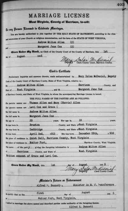 Wife: Margaret Jane Cox 6,2 7 Also known as: Margurite 8 Married: Aug- 1-1935 in Nutter Fort, Harrison Co, WV 1