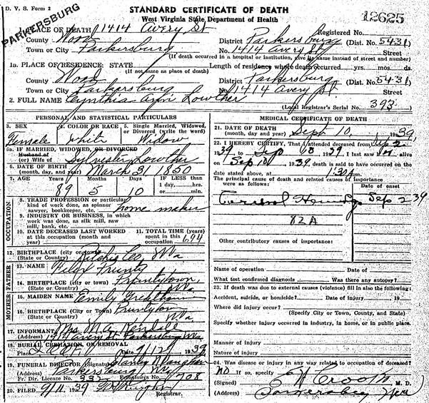 Born: Feb-18-1847 near Pullman, Ritchie Co, WV 1,2 Died: Jul- 8-1903 in Parkersburg, Wood Co, WV 1 Buried: in Parkersburg Memorial Gardens (aka IOOF Cem, 24th St), Wood Co, WV 1 Census: 1860 in Ritchie Co, (W)VA Occupation: minister of M. E. Church in Parkersburg 3 Education: West Virginia University (1879), Drew Theological Seminary 1 Father: William Ireland "Willie" Lowther (1818 - 1904) Mother: Caroline Virginia Mitchell (1820 - 1885)Wife: Cynthia Ann Prunty 3,4 Married: Feb-18-1869 in Ritchie Co, WV 2 Born: Mar-31-1850 in Ritchie Co, (W)VA 5,4,2 Died: Sep-10-1939 in Parkersburg, Wood Co, WV 5 Buried: in Parkersburg Memorial Gardens (aka IOOF Cem, 24th St), Wood Co, WV 5 Resided: in Parkersburg, Wood Co, WV 5,6 Census: 1910, 1920, 1930 in Parkersburg, Wood Co, WV (see note 1) Census: 1860 in Ritchie Co, (W)VA Father: Felix Prunty (1817 - 1895) Mother: Emily Greathouse (1820 - 1908)