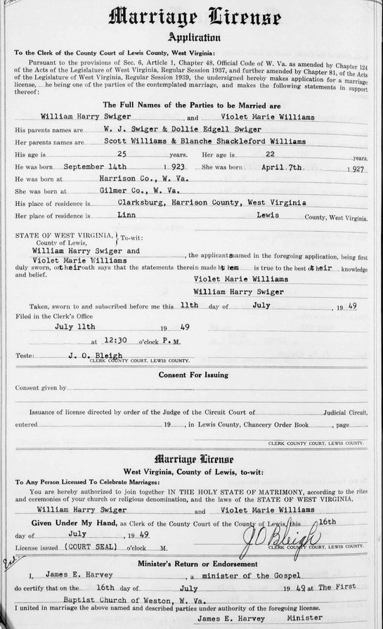 Wife: Violet Marie Williams 1 Also known as: Marie Williams 1,4 Married: Jul-16-1949 in Weston, Lewis Co, WV 5 Born: Apr- 7-1927 in Gilmer Co, WV 5 Died: Apr-24-2014 Resided: in Weston, Lewis Co, WV 1 Resided: 1949 in Linn, Gilmer Co, WV 5 Father: Scott Williams Mother: Blanche Shackleford
