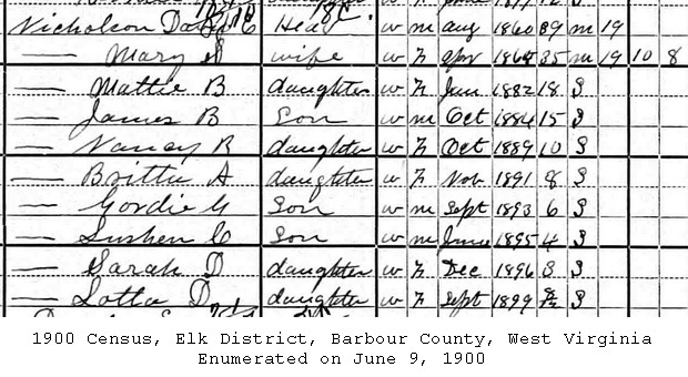 F Child 8: Lettie D. Nicholson Born: Sep- -1899 12 Census: 1910 in Greenbrier District, Doddridge Co, WV Census: 1900 in Barbour Co, WV