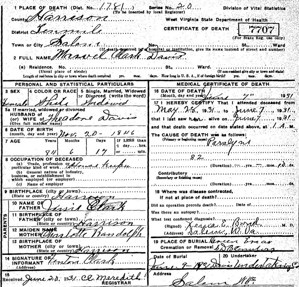 Born: Feb- -1831 in Harrison Co, (W)VA 1,2 Died: Mar-22-1924 in Harrison Co, WV 3 Census: 1900 in Greenbrier District, Doddridge Co, WV Census: 1850 in Doddridge Co, (W)VA Father: Absalom Davis (1809 - 1888) Mother: Polina S. W. Davis (1811 - 1901) Other spouse 1Wife: Marvel Clark 4 Married: Aug-19-1889 3 Born: Nov-20-1846 5,2 Died: Jun- 7-1931 in Salem, WV 5 Buried: in Greenbrier 7th Day Bapt Cem, Co Rd 17, near Miletus, Doddridge Co, WV 5 Census: 1930 in Salem, Harrison Co, WV (see note 1) Census: 1900 in Greenbrier District, Doddridge Co, WV Census: 1880 in New Milton District, Doddridge Co, WV Father: Jesse Clark (1824 - 1889) Mother: Charlotte F. Randolph (1824 - 1905)