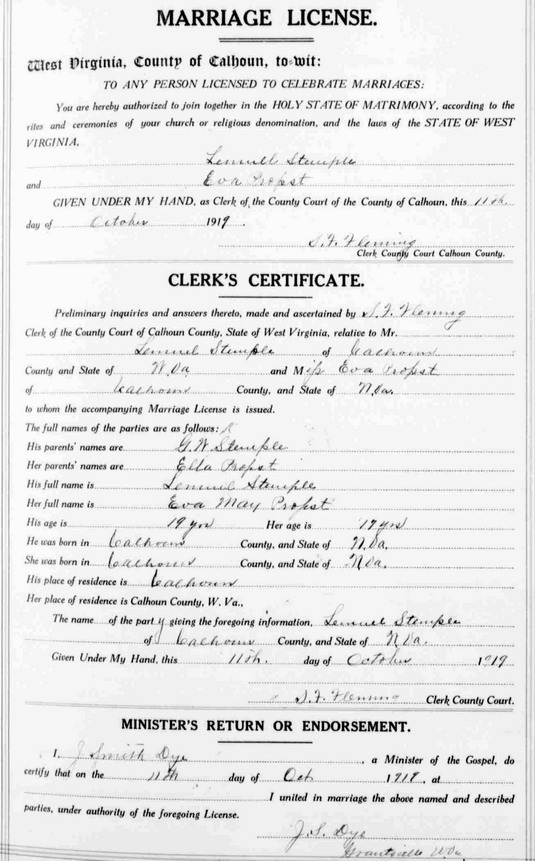 Wife: Eva May Propst Married: Oct-11-1919 in Calhoun Co, WV 2