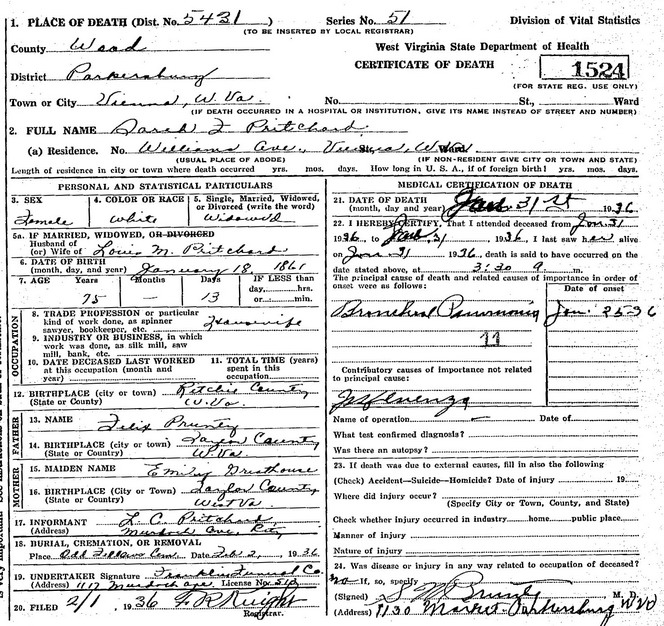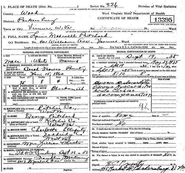 Jul-28-2018Husband: Louis Maxwell Pritchard 1,2 Also known as: Lewis M. Pritchard 3,4,5,6 Born: Jan-15-1860 in Ritchie Co, (W)VA 1 Died: Sep-19-1935 in Vienna, Wood Co, WV 1 Buried: in Parkersburg Memorial Gardens (aka IOOF Cem, 24th St), Wood Co, WV 1,7 Resided: in Vienna, Wood Co, WV 1 Census: 1870, 1880 in Union District, Ritchie Co, WV Occupation: blacksmith 1 Father: George Pritchard (1822 - 1902) Mother: Charlotte J. Ellifritt (1827 - 1902)