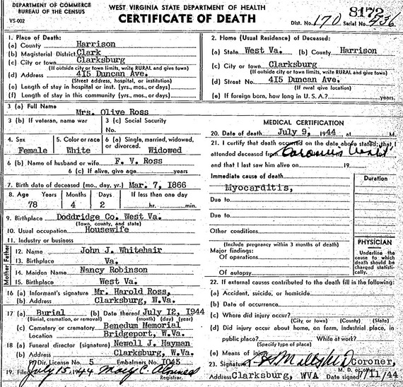 Born: 1858 in Doddridge Co, (W)VA 2,3 Died: 1905 2 Buried: in Bridgeport Cemetery, Bridgeport, Harrison Co, WV 4 Census: 1870, 1880 in Southwest District, Doddridge Co, WV Census: 1860 in Doddridge Co, (W)VA Occupation: 1880 farm laborer 5 Father: Fuller Ross (1817 - 1879) Mother: Nancy Douglass (1823 - 1898)Wife: Olive Whitehair Married: Jul-24-1879 in Doddridge Co, WV 3 Born: Mar- 7-1866 6 (see note 1) Died: Jul- 9-1944 in Clarksburg, Harrison Co, WV 6 Buried: in Bridgeport Cemetery, Bridgeport, Harrison Co, WV 6,4 Resided: in Clarksburg, Harrison Co, WV 6 Resided: 1879 in Doddridge Co, WV 7 Father: John J. Whitehair Mother: Nancy M. Robinson