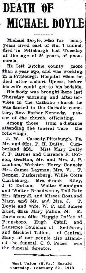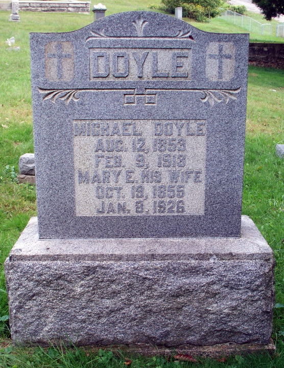 Jul-28-2018Husband: Michael Doyle Born: Aug-12-1853 in Ireland 1,2,3 Died: Feb- 9-1913 in Pittsburgh, Allegheny Co, PA 1,4 Buried: in Blockhouse Hill Cemetery (Catholic section), West Union, Doddridge Co, WV 5,4 Cause of death: pneumonia 4 Census: 1910 in Clay District, Ritchie Co, WV Resided: 1884 in Ritchie Co, WV 2 Occupation: farmer 3 Father: Mother: