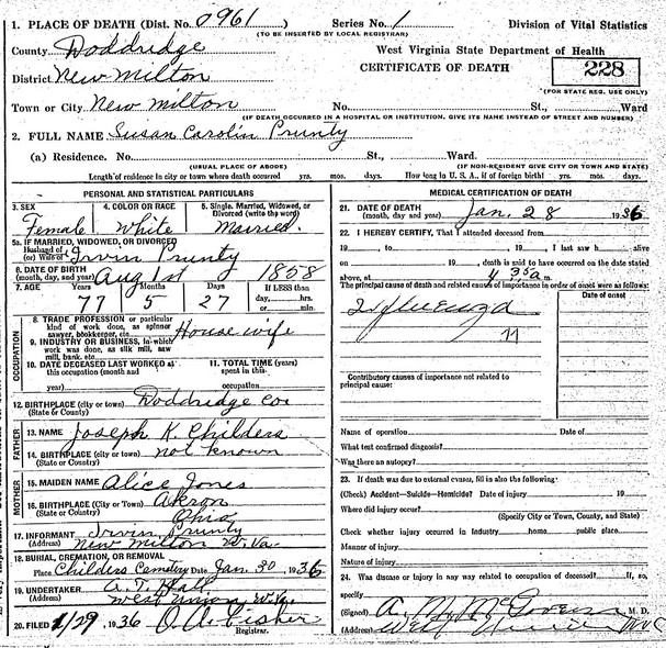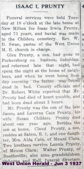 Jul-28-2018Husband: Isaac Irvin Prunty 1 Also known as: Irvin I. Prunty 2,3,4,5,6 Born: Jan-28-1866 in Doddridge Co, WV 1 Died: May-29-1937 in New Milton, Doddridge Co, WV 1 Buried: in Childers Cemetery, New Milton, Doddridge Co, WV 1,7 Resided: in New Milton, Doddridge Co, WV 8,1,7,2,5 Occupation: farmer 1 Father: James Taylor Prunty (1847 - 1913) Mother: Loverna Cain (1846 - 1900)
