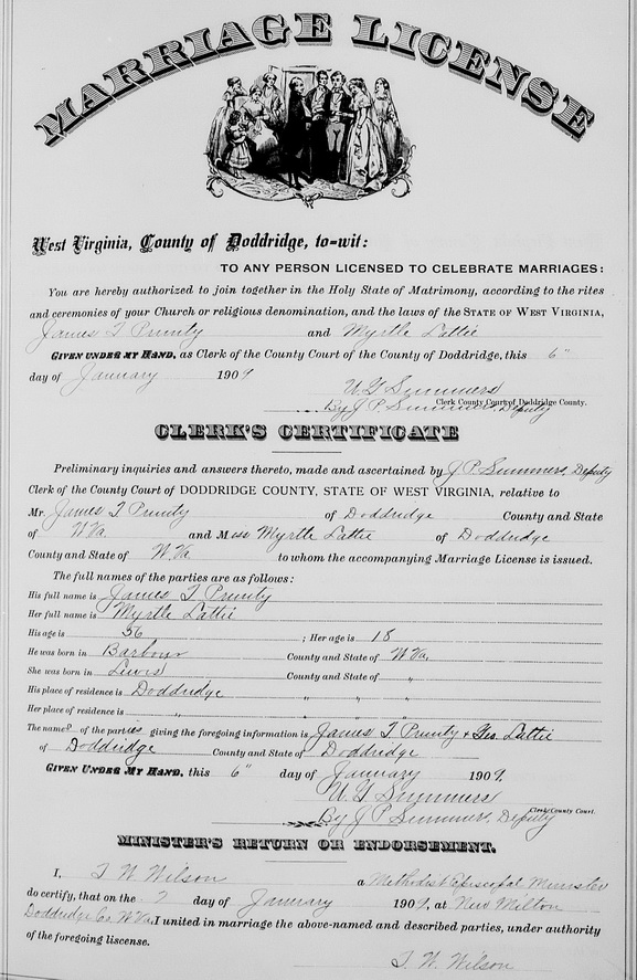 Sources: (1) 1900 Census, Doddridge County, WV (New Milton District) (2) Marriage record of son. (3) Donald Edward Ramage, Doddridge County Cemeteries, Vol. I, 4117 Almaville Rd, Smyna TN 37167 (1988, rev. 1999), Based on obituary in West Union Record, 7 Nov 1913. (4) Harrison County Marriage Records, Clarksburg, WV. (5) Doddridge County Death Records, West Union, WV, Identified as James T. Prunty, age 67, married, farmer; died Nov 28 1913 in Harrison County, cause of death stomach trouble. DR p. 127. (6) Doddridge County Marriage Records, West Union, WV. (7) Death record of son. (8) WV State Dept of Health, Div of Vital Statistics, Death Certificate (http://www.wvculture.org/vrr/va_dcsearch.aspx) (9) Death record of wife, His own obituary incorrectly states his middle name as Irwin. Both his death record and that of his wife show it as Irvin. (10) Death record of daughter. (11) 1910 Census, Doddridge County, WV (New Milton District) (12) Marriage record of daughter. (13) Obituary. (14) Death record of wife. (15) Doddridge County WV Marriages 1845-1937, Wes Cochran, 156 Gihon Meadows, Apt 150, Parkersburg, WV 26101 (Jan 1993) (16) Obituary of brother. (17) Social Security Death Index, Social Security card issued in West Virginia before 1951. Event Notes Note (1) Birth date given in 1900 Census as May 1883; but age 26 in 1908 marriage record would put it in about 1882, and SSDI states May 27 1881.Name Index