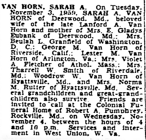 F Child 10: Thelma Allegra VanHorn Born: Dec- 2-1917 in Blandville, Doddridge Co, WV 19,3 Died: May-29-1957 18,3 Buried: in Cedar Hill Cemetery, Suitland, Prince Georges Co, MD 18 Census: 1920, 1930 in Southwest District, Doddridge Co, WV Husband: ___ Climenhaga