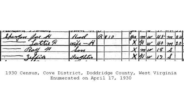 Sources: (1) 1930 Census, Doddridge County, WV (Cove District). (2) West Virginia Deaths Index, 1853-1973 [database on-line], Ancestry.com. (3) Doddridge County WV Marriages 1845-1937, Wes Cochran, 156 Gihon Meadows, Apt 150, Parkersburg, WV 26101 (Jan 1993) (4) Findagrave.com. (5) Obituary of wife's mother. (6) Doddridge County Marriage Records, West Union, WV, Identified as Joe Spurgeon, 24, b. & res. in Doddridge Co; and Lottie Lowther, 20, b. & res. in Doddridge Co. Married Apr 11 1909 "on the highway near Frederic Bode's.", MR p. 213. (7) Social Security Applications and Claims Index, 1936-2007 [database on-line], Ancestry.com. (8) Headstone (year only) (9) Doddridge County WV Deaths 1853-1969, Wes Cochran, 156 Gihon Meadows, Apt 150, Parkersburg, WV 26101. (10) Obituary of mother. (11) Social Security Death Index. (12) Ritchie County Historical Society (David M. Scott, Editor), Ritchie County, West Virginia Cemeteries through 1993, McClain Printing Co, Parsons, WV, 1995. (13) 1940 Census, Doddridge County, WV (Cove District) (14) Obituary of son. (15) West Virginia Births Index, 1853-1969 [database on-line], Ancestry.com. (16) Ohio Deaths, 1908-1932, 1938-1944, and 1958-2007 (online), Ancestry.com and Ohio Department of Health. (17) Social Security Death Index, Social Security card issued in West Virginia before 1951. (18) Hancock County Marriage Records, New Cumberland, WV.Name Index