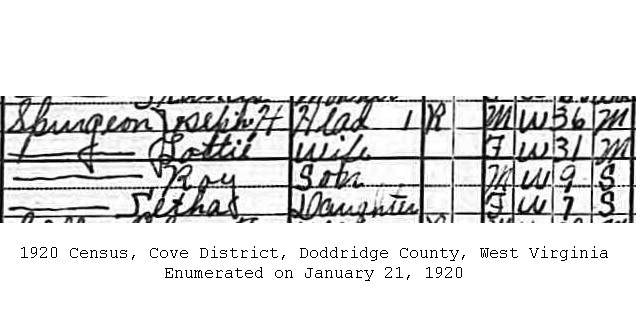 Jul-28-2018Husband: Joseph Henry Spurgeon Census name: Joe H. Spurgeon 1 Born: Jan- 8-1884 in Doddridge Co, WV 2,3,1 Died: May-14-1959 in Auburn, Doddridge Co, WV 2 Buried: in Spurgeon (aka Pleasant Valley or Dunkard) Cem, Bear Fork (Co Rd 62/2), Doddridge/Gilmer Co, WV 2,4 Census: 1910, 1920, 1930 in Cove District, Doddridge Co, WV Occupation: farmer 2 Father: Oliver Spurgeon Mother: Frances Smith