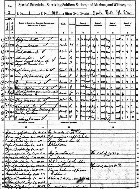 Sources: (1) 1900 Census, Calhoun County, WV. (2) Doddridge County WV Marriages 1845-1937, Wes Cochran, 156 Gihon Meadows, Apt 150, Parkersburg, WV 26101 (Jan 1993) (3) Findagrave.com. (4) 1880 Census, Doddridge County, WV (Southwest District). (5) 1890 Veterans Schedules [database online], Ancestry.com and National Archives & Records Administration. (6) Military Grave Marker. (7) Headstone (year only) (8) Headstone. (9) 1900 Census, Doddridge County, WV (West Union District) (10) Roane County Marriage Records, Spencer, WV. (11) 1940 Census, Lewis County, WV. (12) 1920 Census, Lewis County, WV. (13) Lewis County Death Records, Weston, WV. (14) Roane County Marriage Records, Spencer, WV, Identified as Samuel J. Smith, 22, b. & res. in Doddridge Co; and Hulda I. Nicholson, 21, b. Doddridge Co, res. Roane Co. Married Nov 1 1894 "at the Residence of Pastor M. P. Church in Spencer," officiated by M. L. Smith. Informants for marriage license: Thos. V. Smith & Samuel J. Smith of West Union, Doddridge County. (NOTE: Thomas Virgil Smith and Samuel Johnson Smith were first cousins.), MR p. 271 : www.wvculture.org/vrr/va_view.aspx?Id=11553298&Type=Marriage. (15) 1910 Census, Lewis County, WV. (16) WV State Dept of Health, Div of Vital Statistics, Death Certificate (http://www.wvculture.org/vrr/va_dcsearch.aspx) (17) Calhoun County WV Marriages 1856-1927, Wes Cochran, 2515 10th Ave, Parkersburg, WV 26101 (Oct 1989) (18) Calhoun County Historical & Genealogical Society, Cemeteries in Calhoun County West Virginia, Grantsville Printing Co, Grantsville WV (1985)Name Index