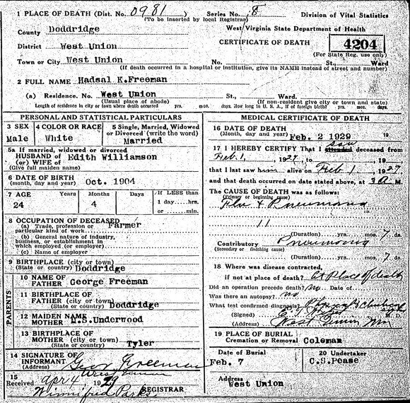 Jul-28-2018Husband: Hadsal K. Freeman Born: Oct- -1904 in Doddridge Co, WV 1 Died: Feb- 2-1929 in West Union, Doddridge Co, WV 1 Buried: in Freeman-Coleman Cemetery, Rt 18 N (Crystal Lake), West Union, WV 1 Cause of death: flu & pneumonia 1 Resided: in West Union, Doddridge Co, WV 2,1 Census: 1910, 1920 in West Union District, Doddridge Co, WV Occupation: farmer 1 Father: George Freeman (1857 - 1935) Mother: Margaret Sophia Underwood (1862 - 1946)