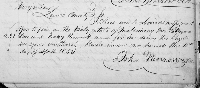 Sources: (1) Lewis County Marriage Records, Weston, WV. (2) Lewis County Marriage Records, Weston, WV, Identified as Isaac Dix, widower, 65, b. Chester Co Pa, res. Upshur Co, son of Stephen & Jamima Dix; and Mary Bonnett, widow, 66, b. Hardy Co, res. Lewis Co, dau of Nicholas & Margaret Linger. Married Apr 18 1854 in Lewis County. (Note: The license for this marriage was issued in a separate document on the same date: http://www.wvculture.org/vrr/va_view.aspx?Id=10709077&Type=Marriage ), MR p. 2 : http://www.wvculture.org/vrr/va_view.aspx?Id=10710466&Type=Marriage. (3) Joy Gilchrist Stalnaker (editor), Lewis County West Virginia: Her People and Places, Hackers Creek Pioneers Descendants, Horner, WV 26372 (2000), p. 65.Name Index