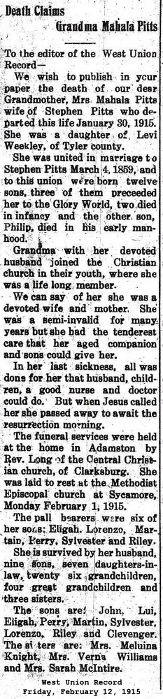 Born: Mar- 7-1838 1 Died: Aug-24-1924 in Clarksburg, Harrison Co, WV 1 Buried: in Sycamore Methodist Cemetery, btwn Rt 19 & US 50, near West Milford, Harrison Co, WV 1 Census: 1910, 1920 in Adamston (Clarksburg), Harrison Co, WV Census: 1900 in Tenmile District, Harrison Co, WV Census: 1880 in McElroy District, Tyler Co, WV Occupation: farmer 1,2 Father: John Pitts (1817 - ) Mother: Margaret Gatrell (1816 - )Wife: Mahala Weekley 3 Married: Mar- 4-1859 4 (see note 1) Born: Oct- -1838 2 Died: Jan-30-1915 5 Buried: in Sycamore Methodist Cemetery, btwn Rt 19 & US 50, near West Milford, Harrison Co, WV 5 Resided: in Adamston (Clarksburg), Harrison Co, WV 5 Census: 1910 in Adamston (Clarksburg), Harrison Co, WV Census: 1900 in Tenmile District, Harrison Co, WV Census: 1880 in McElroy District, Tyler Co, WV Census: 1850 in Doddridge Co, (W)VA (see note 2) Father: Levi M. Weekley Mother: Sarah ___ Notes