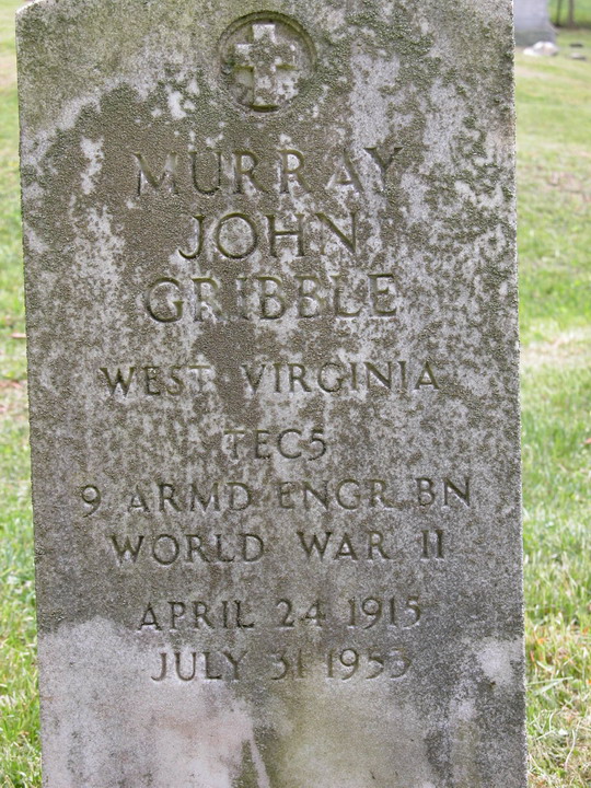 Jul-28-2018Husband: Murray John Gribble Census name: John M. Gribble 1 Born: Apr-24-1915 2 Died: Jul-31-1953 in Doddridge Co, WV 2,3 Buried: in Grove Baptist Church Cemetery, Grove-Summers Rd (CR 19), Doddridge Co, WV 2 Census: 1930 at Slab Creek, Ritchie Co, WV 4 Census: 1920 in Troy District, Gilmer Co, WV Military: Tec 5, US Army, 9th Armored Engineer Bn, WW II 2 Father: Howard Hull Gribble (1881 - 1957) Mother: Bessie Iona Campbell (1883 - 1925)