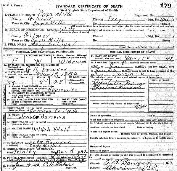 Born: Jan-18-1851 in Highland Co, VA 1,2,3 Died: Feb- 6-1933 at Coxs Mills, Gilmer Co, WV 4 Resided: in Gilmer Co, WV 5 Census: 1900, 1920 in Troy District, Gilmer Co, WV Occupation: farmer 6 Father: Leonard Bowyer Mother: Catharine ___ Other spouse 1 Other spouse 2Wife: Mary Burrows Married: Sep- 5-1883 in Doddridge Co, WV 7 Born: May-18-1852 in Harrison Co, (W)VA 8,9,2 Died: Jan-16-1942 at Coxs Mills, Gilmer Co, WV 10 Buried: in Trinity Cemetery, Stone Lick, Coxs Mills, Gilmer Co, WV 8 Resided: at Coxs Mills, Gilmer Co, WV 8 Census: 1900, 1920 in Troy District, Gilmer Co, WV 11 Census: 1880 in New Milton District, Doddridge Co, WV Father: Jesse Burrows (1823 - 1914) Mother: Delilah Wolf (1826 - ) Other spouse 1