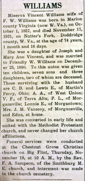 Jul-28-2018Minerva Vincent Born: Oct- 1-1857 in Marion Co, (W)VA 1,2,3,4 Died: Nov-17-1931 at Nutters Fork, Doddridge Co, WV 1,3,5,4 Buried: in Chestnut Grove Cemetery, Big Flint, Doddridge Co, WV 6,1 Census: 1910, 1920, 1930 in West Union District, Doddridge Co, WV Census: 1900 in Grant District, Doddridge Co, WV Census: 1860 in Doddridge Co, (W)VA Father: Joseph Isaac (twin) Vincent (1814 - 1888) Mother: Mary Ann Brien (1825 - 1860) Other spouse 2