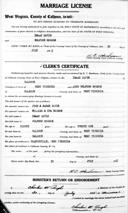 Wife: Welford Rogers Married: Jul-30-1935 in Minnora, Calhoun Co, WV 3