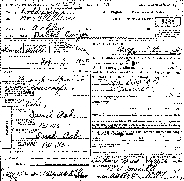 Born: Aug- 7-1851 in Center Point, Doddridge Co, WV 1,2 Died: Mar-26-1926 in Center Point, Doddridge Co, WV 1 Buried: in Center Point Christian Church Cemetery, Doddridge Co, WV 1 Census: 1880, 1910 in McClellan District, Doddridge Co, WV Occupation: farmer 3 Father: Alfred Swiger (1825 - 1912) Mother: Elizabeth Underwood (1830 - 1904)Wife: Delila Ash 4 Married: Apr-10-1870 in Doddridge Co, WV 2 Born: Feb- 8-1852 5 Died: Aug-24-1922 in Ashley, Doddridge Co, WV 5 Buried: on home farm 5 (see note 1) Census: 1880, 1910 in McClellan District, Doddridge Co, WV Census: 1860 in Doddridge Co, (W)VA Father: Israel Ash (1826 - 1872) Mother: Sarah Ash (1825 - 1893)
