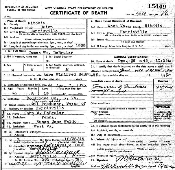 Jul-28-2018Husband: James William DeBrular Also known as: William DeBrular 1 Born: Apr- 7-1873 in Doddridge Co, WV 2,3,4 Died: Dec-26-1945 in Ritchie Co, WV 5,4 Buried: in IOOF Cemetery, Harrisville, Ritchie Co, WV 2,6 Resided: in Harrisville, Ritchie Co, WV 2 Census: 1880 in Clay District, Ritchie Co, WV Occupation: oil producer, mayor of Harrisville 2 Father: John Morgan DeBrular (1843 - 1924) Mother: Susan Jane Waldo (1844 - 1934)